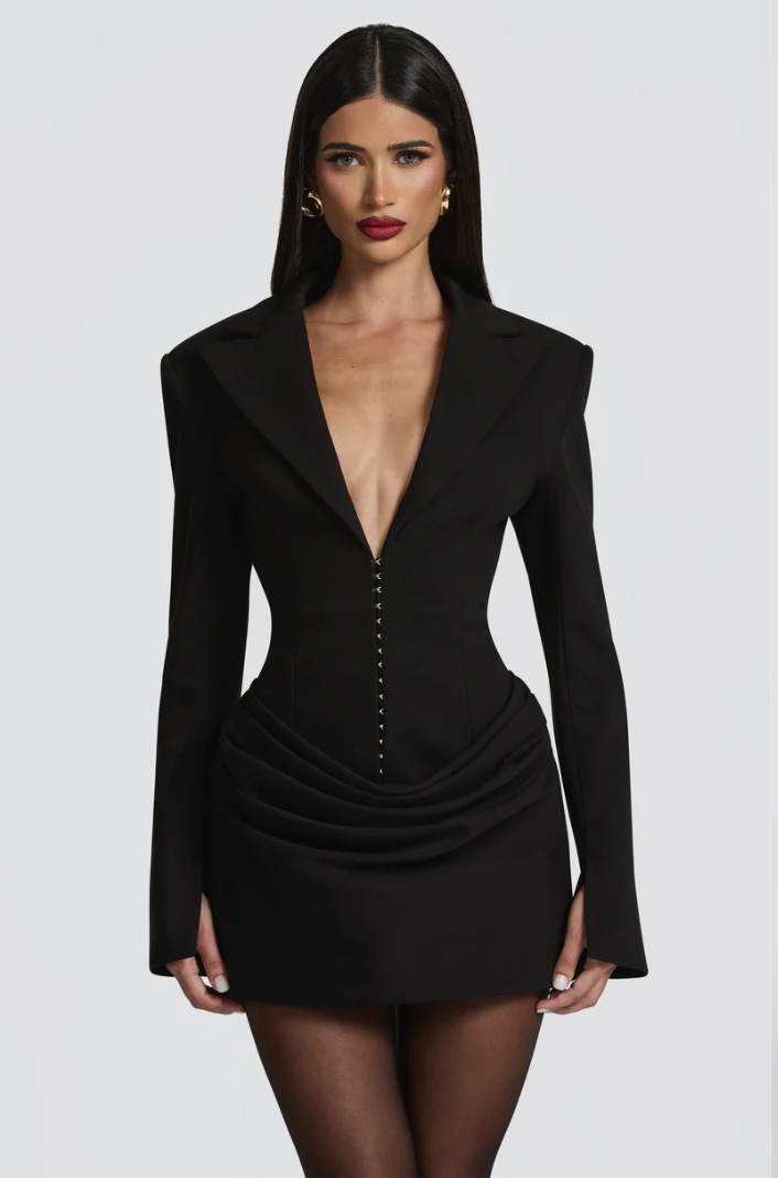 The Susie Mini Dress in black features a tailored, single-breasted blazer style with sleek hook & eye detailing. Crafted from non-stretch woven suiting fabric, it offers a refined silhouette with a pleated cowl mini skirt and an adjustable waist strap for a precisely tailored fit.